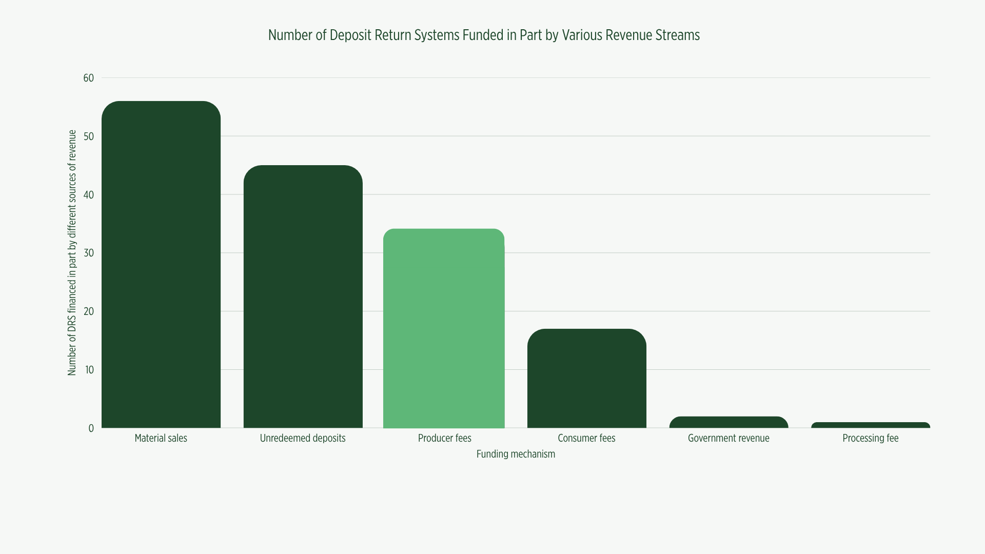 Over half of deposit return systems rely on producer fees as a revenue source, alongside material revenues and unredeemed deposits.