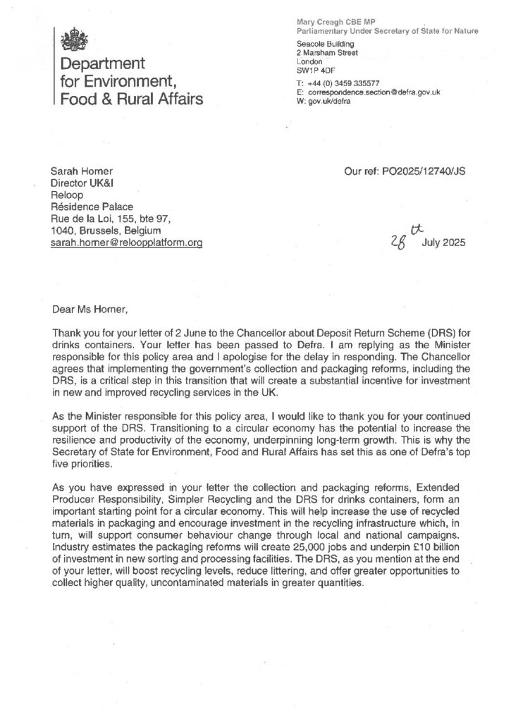 This letter from the Parliamentary Under Secretary of State for Nature responds to Reloop’s correspondence to the Chancellor of the Exchequer.