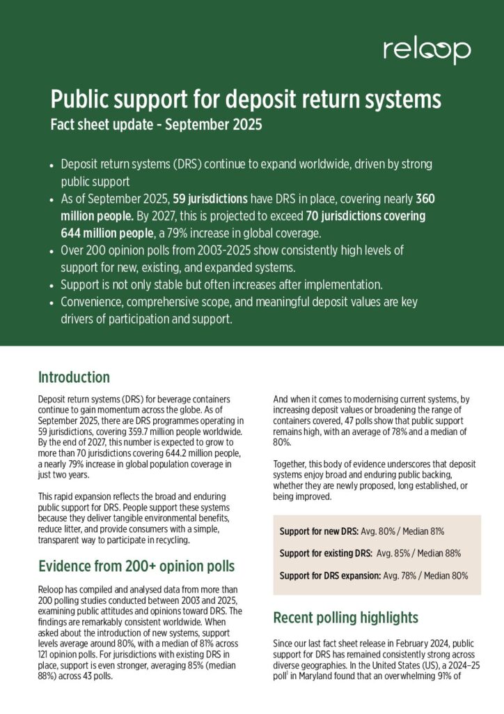 Reloop’s latest analysis builds on the 2024 ‘Public support for deposit return systems’ fact sheet.