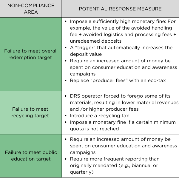 Oversight & Enforcement by state agencies incentivises producers to meet performance targets. When producers fail to meet targets, the government can respond with strong enforcement measures, including financial penalties. Effective legislation may also include a “trigger” mechanism to increase the minimum deposit value, if/when performance targets are not met. Penalties clearly connect to the expectations outlined in targets and responsibility accrues to a specific party or parties