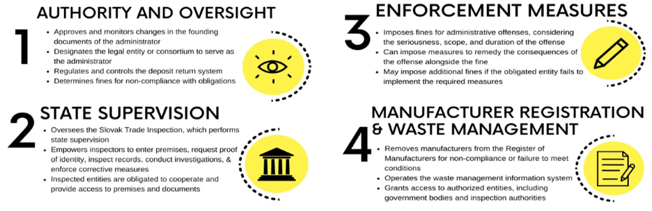 The Slovak DRS regulation establishes the authority and responsibilities of government bodies in managing beverage packaging and waste. It includes provisions for state supervision, administrative offences, and the imposition of fines. Slovakia’s legislation stipulates the Ministry’s authorities as follows: