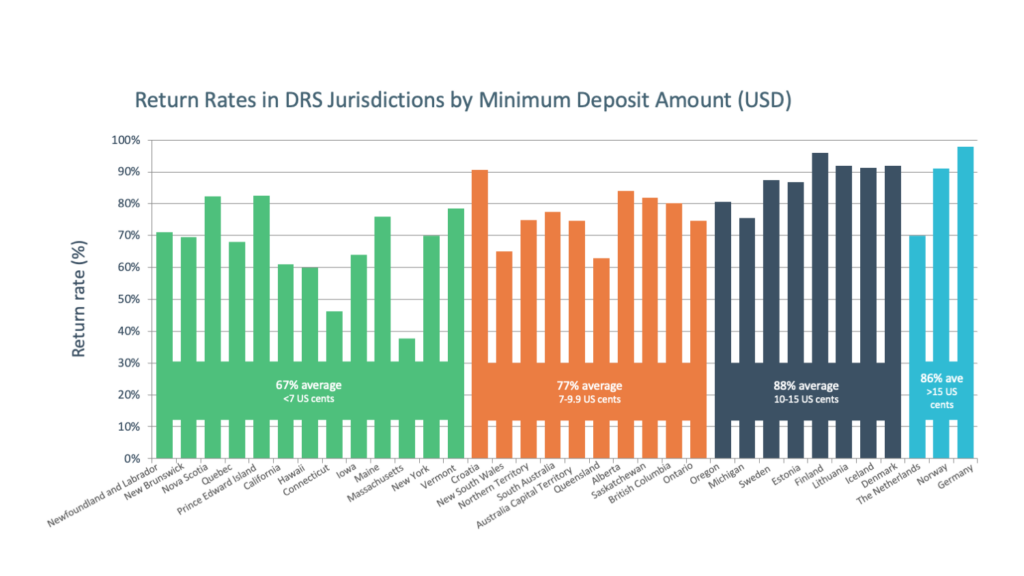 The chart below shows return rates in DRS jurisdictions by Minimum Deposit Amount (USD). One can see clearly that far lower rates of return in Canada and US states are linked to lower deposit rates. In states (e.g., Oregon and Michigan again) or countries (e.g., Germany and Norway) with deposits at 10-15 US cents, the return rates are consistently above 90%.