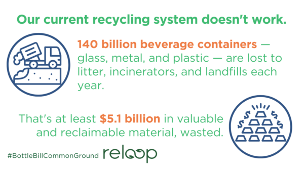 That’s not what happens now with most beverage containers in the U.S. At least $5.1 billion in valuable and reclaimable beverage containers (glass, metal, and plastic) are lost to litter, incinerators, and landfills each year. That amounts to 140 billion individual containers wasted. No wonder beverage containers are the number-one item littering our coastal areas.