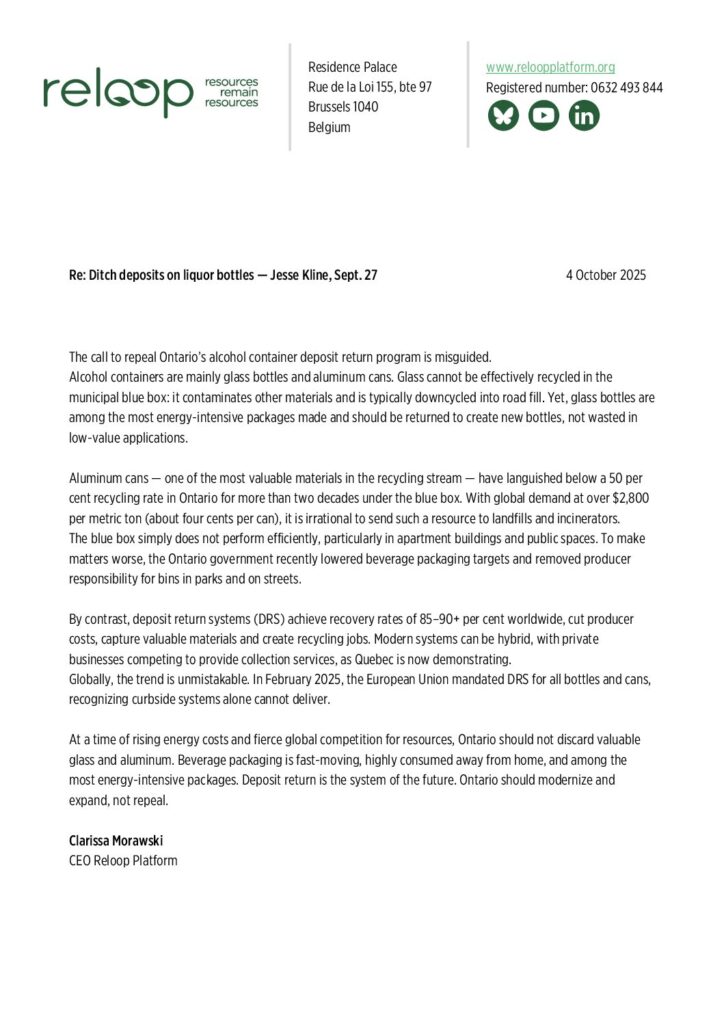 Reloop’s CEO, Clarissa Morawski responded setting out the evidence on how deposit return systems (DRS) are the global trend and why Ontario should modernise and expand, not repeal.