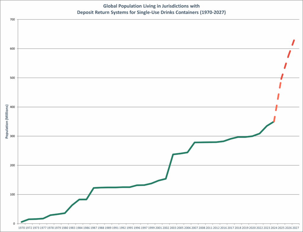 Beyond Canada, the adoption of DRS is gaining momentum as governments worldwide recognise their effectiveness in boosting recycling rates and addressing global challenges like plastic pollution and climate change. As of January 2025, nearly 357 million people across 57 jurisdictions have access to deposit systems. This number is expected to grow significantly, with projections estimating that by the end of 2027, approximately 641 million people will be covered by DRS in 70 jurisdictions (Figure 1).
