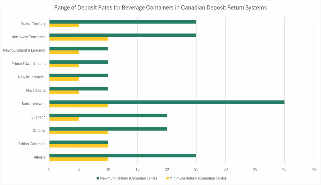 In Canada, deposit values are significantly lower than in top-performing systems internationally. Figure 4 shows the range of deposit values in each province and territory as of January 2025 (with Quebec and New Brunswick data reflecting 2022 deposit values due to the availability of return data). While the top three performing programmes in Canada—Alberta, Saskatchewan, and British Columbia—have a minimum deposit of $0.10, six out of 11 Canadian DRS still rely on minimum deposits of just $0.05.