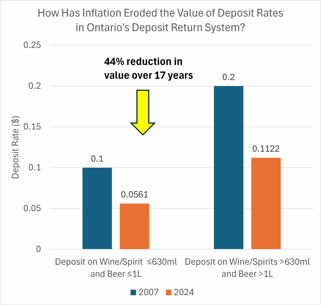 Figures 5 and 5a illustrates how Ontario’s deposit values, set in 2007 at $0.10 (for wine and spirits ≤630ml and beer ≤1L) and $0.20 (for wine and spirits >630ml and beer >1L), would compare today if adjusted for inflation. To maintain their original purchasing power in 2024 dollars, these deposits would need to rise to $0.14 and $0.29, respectively. In other words, their real value has dropped to just$0.056 and $0.112—representing a 44% decline in value.