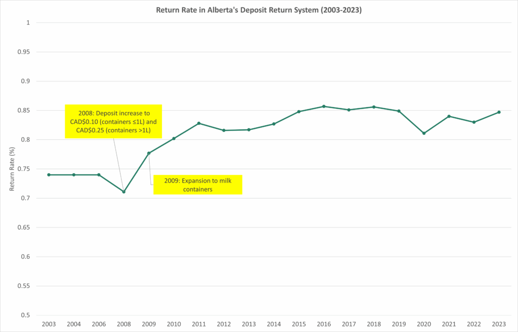 This devaluation underscores the need to periodically review and adjust deposit rates to reflect inflation, ensuring they remain effective in driving consumer participation and maximising return rates. Alberta provides a compelling case study of the impact of increasing deposits on return rates. When it increased its deposit at the end of 2008, the result was a 10 percentage-point increase in the overall return rate by the end of 2009 (Figure 6).