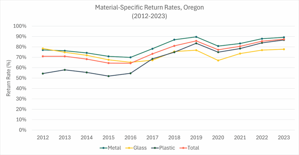 Both Oregon (US) and Norway offer additional evidence of the positive impact of deposit values on return rates. In Oregon, return rates had stagnated at around 60% between 2014 and 2016. However, in 2017, the state doubled its deposit from USD$0.05 to USD$0.10, resulting in a remarkable turnaround. By the end of that year, the return rate had surged to 73%, eventually reaching 86% by 2019.