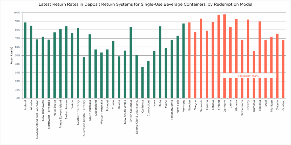 Ease of container return and accessibility: Next to deposit values, the convenience of return – that is, how easy it is to return empty containers to designated collection points – also plays a critical role in system performance. Reloop’s research shows that jurisdictions that utilise a return-to-retail (R2R) model — where retailers are legally required to accept container returns and provide refunds — achieve a median return rate of 84% (Figure 9). This is significantly higher than the 69% median return rate in jurisdictions that rely on depots or hybrid models, where depots operate alongside retail stores.